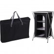 PROGARDEN prijenosni ormar za kampiranje s policama. Može se potpuno sklopiti u transportnu kutiju, idealno za putovanja, kao kamperski namještaj i na vikendici. Aluminijska konstrukcija s radnom pločom od MDF materijala, školjka od 600D poliestera u crnoj boji, vrlo otporno na kidanje i habanje. Cijeli ormar je prikladan za vanjsku upotrebu, materijali su otporni na vodu i sunčevu svjetlost. Transportna kutija s ručkama. Ukupno 3 unutarnje police. Dimenzije: 60x53x97cm. Težina: 6,3kg.