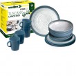 Brunner set posuđa od melamina Tuscany 16 dijelova. Protuklizno melaminsko posuđe – protuklizna brtva integrirana u dno tanjura znatno smanjuje vjerojatnost klizanja ili čak pada posuđa. Osim toga, značajno se smanjuje iritantni zvuk zveckanja tijekom vožnje. Sadržaj: 4 tanjura za večeru, d25 cm; 4 tanjura za juhu, d21 cm; 4 tanjura za desert, d21 cm; 4 šalice, 300 ml. Može se koristiti u perilici posuđa, pogodno za zamrzavanje, nije pogodno za mikrovalnu peć. Plave boje.